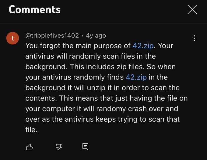 It is clearly not a good idea to set a top level domain (TLD) to a common file extension. This can help phishers and other malicious actors trick people into clicking on malicious links. In fact, a Twitter user says that a 4-year-old YouTube comment containing the text "42.zip" is now converted into a link. He added, "Guess what visiting that domain does? IT AUTOMATICALLY DOWNLOADS THAT ZIP BOMB. (So do not visit)"