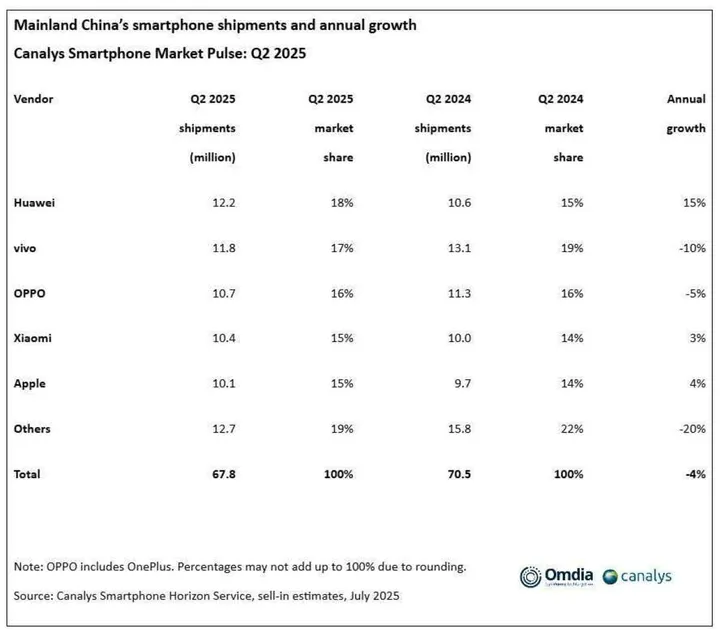 The Chinese smartphone market saw a minor slowdown in the second quarter of 2025, with shipments dipping by around 4% compared to the same period last year. Even so, the latest figures from