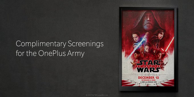 OnePlus customers stand a chance of winning a free ticket to Star Wars: The Last Jedi. OnePlus just announced on its official Twitter account in India that it will be giving away 10,000 tickets for the old Sci-Fi sequel. The announcement comes as a token of thanks to the Indian fan base of OnePlus as the brand turns 3 years old.