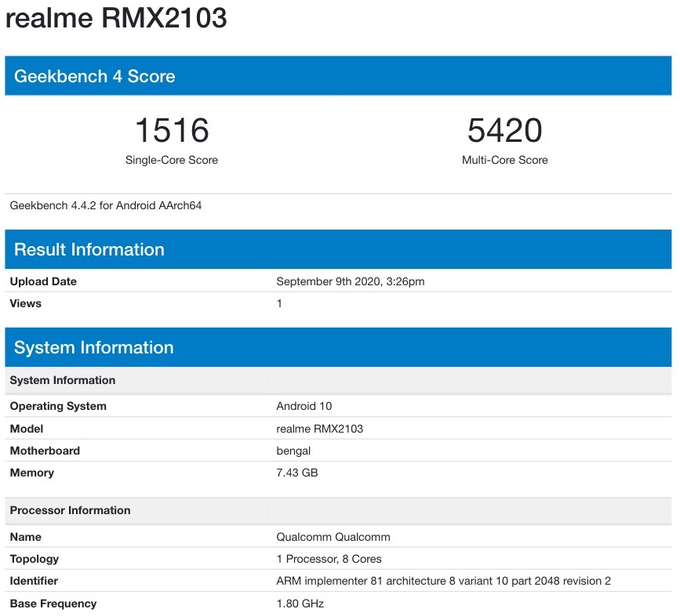 The handset scored 1,516 points on single-core tests and 5,420 in the multi-core department. Worth noting that these results have been achieved on the GeekBench 4.x platform. The results will be less expressive once the device passes through the GeekBench 5.x benchmark.
