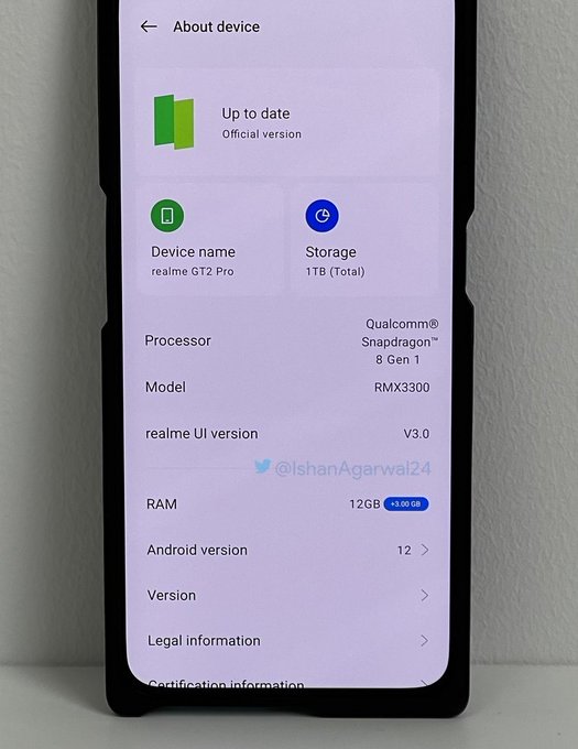 report that teased the presence of the Snapdragon 8 Gen1 chip under the hood. Aside from that, it hints at 12GB RAM and 3GB of virtual RAM for seamless multitasking. Moreover, the device seems to be running Realme's proprietary Realme UI 3.0 based on Android 12 OS. However, the most notable information revealed by the image is that the GT 2 Pro will offer up to a whopping 1TB of built-in storage capacity.