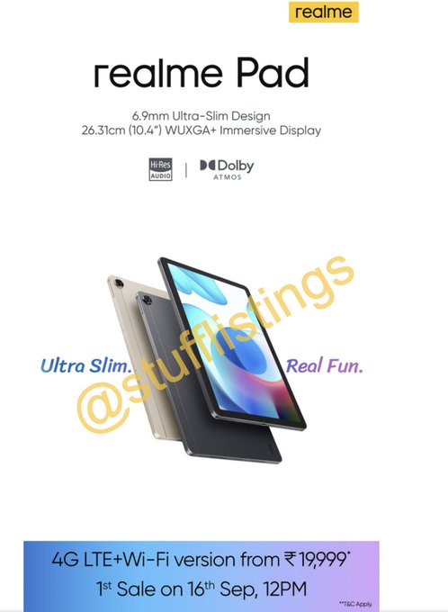 Realme Pad price in India has been leaked along with the upcoming tablet's specifications ahead of an official unveiling. The Chinese tech company's first-ever tablet is set to launch in India today, September 9. More shreds of information are likely to be revealed at today's launch event. However, the rumor mill hasn't ceased churning out speculations surrounding the upcoming tablet. Now, in a new development, some details of the Realme tablet have surfaced online. The aforesaid leak sheds light on the pricing of the tablet.