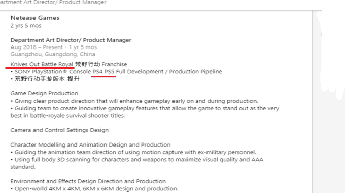 PS4. This was spotted in his description. However, after it caught the eyes of the internet, the information was updated to "SONY PlayStation® Console". The new description makes it less specific. Nevertheless, a current search for the Netease employee LinkedIn account suggests that it is no longer available.
